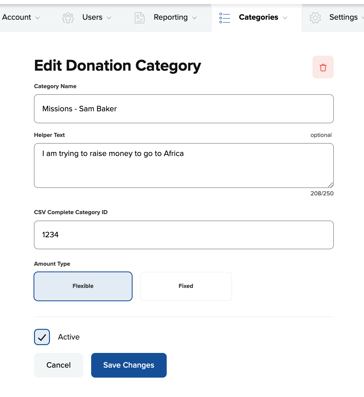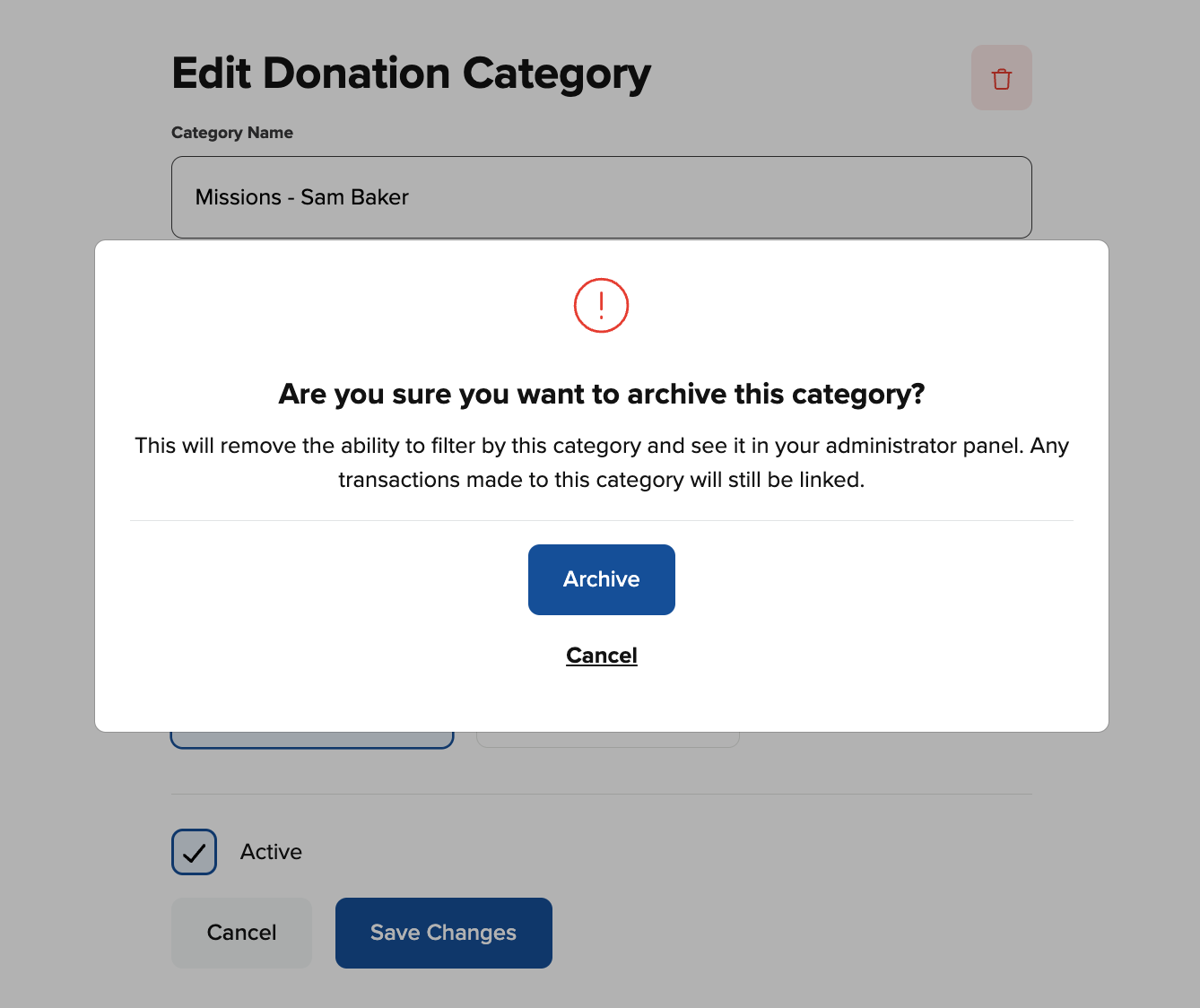 Archiving a category will allow you to remove it from your list of All Categories. To archive a category, go to Categories>Donations or Categories>Purchases and click on the Edit pencil of the one you want to archive. You will now see a trashcan icon to the upper right. *Please note that you will lose the ability to filter by categories that have been archived. If you just need to keep donors from seeing a category when donating but you still need it for reporting, it is best to just hide the category using the toggle on the categories list. (see Help Center article for Displaying or Hiding Categories)