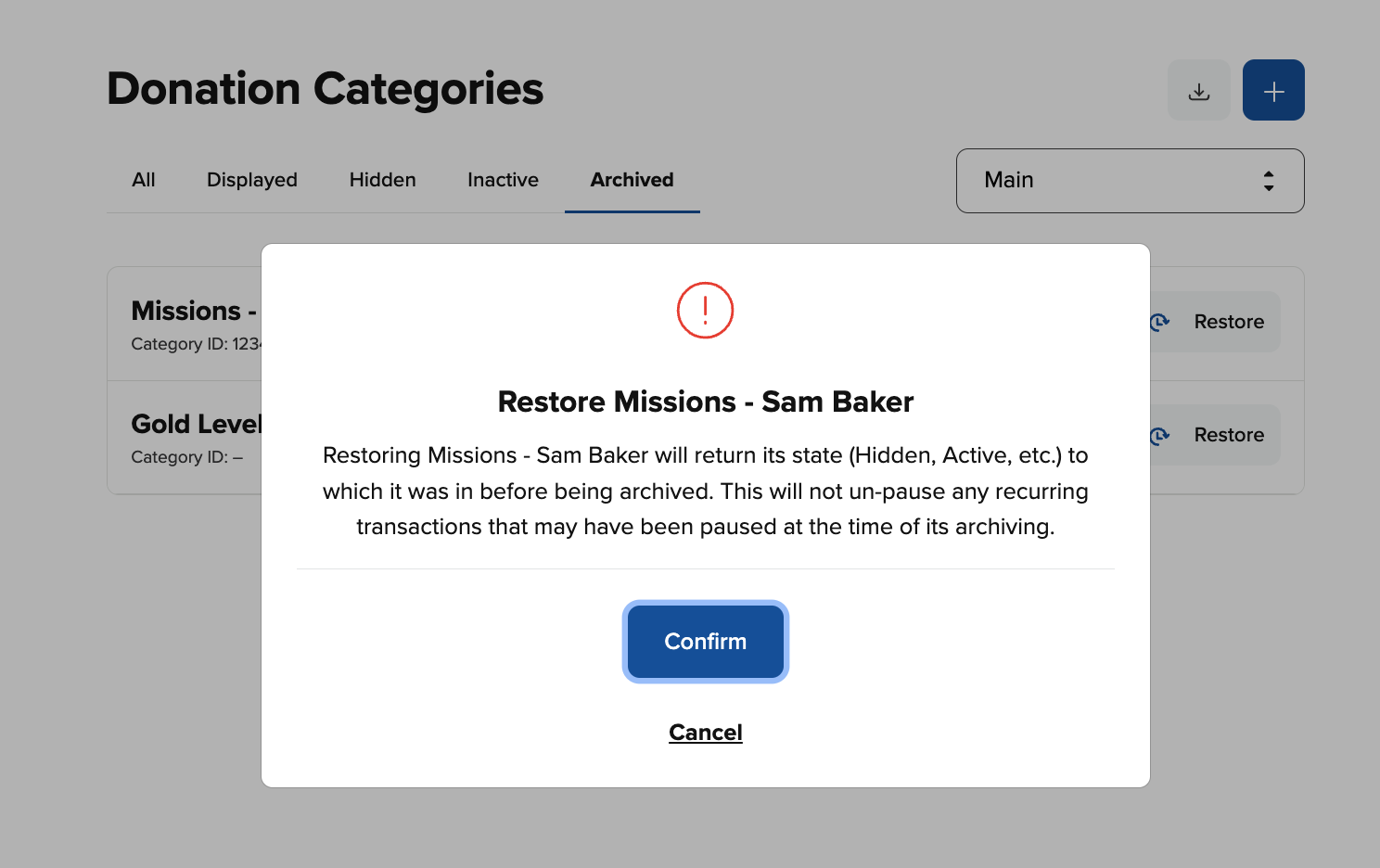 2. When a category is archived and there are active recurring donations set to it, they will continue to process to that category until edited by either a member or an admin. When editing, the user will no longer have that category available.