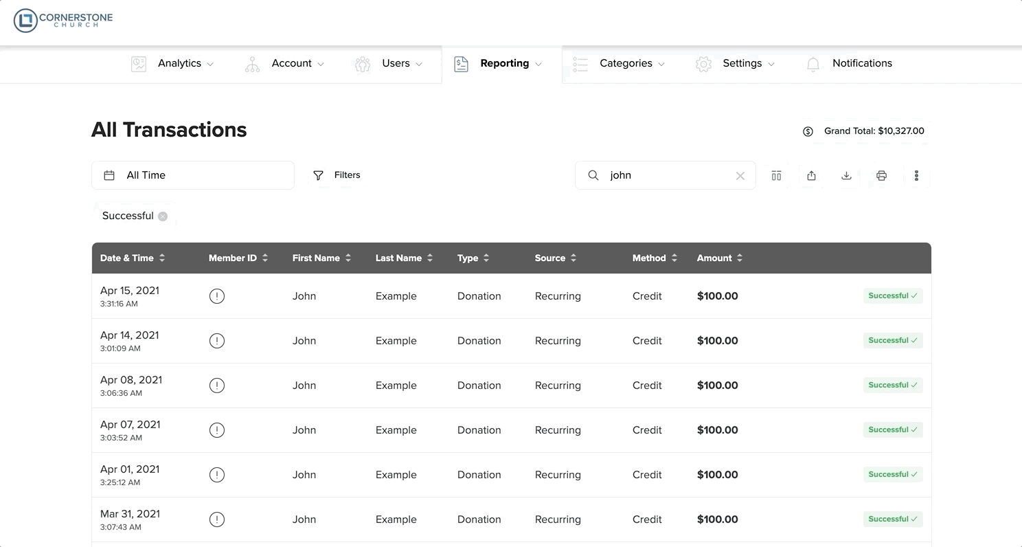 Input the Arena Member ID into the Member ID field for each member profile in SecureGive. You will only have to do this one time for each member, and it will stay connected to them for all future transactions. Do this by clicking the exclamation point in the Member ID column from the “All Transactions” page, and then enter their member ID and choose the Update Member ID button.