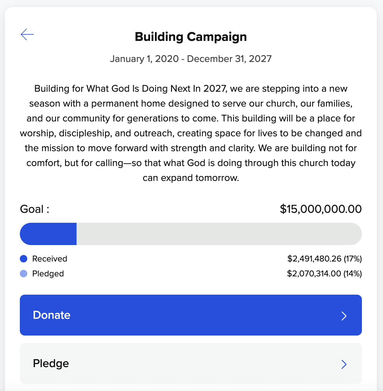 (If you were to click the Donate button, you would be able give towards your pledge or give towards the campaigns without creating a pledge.)