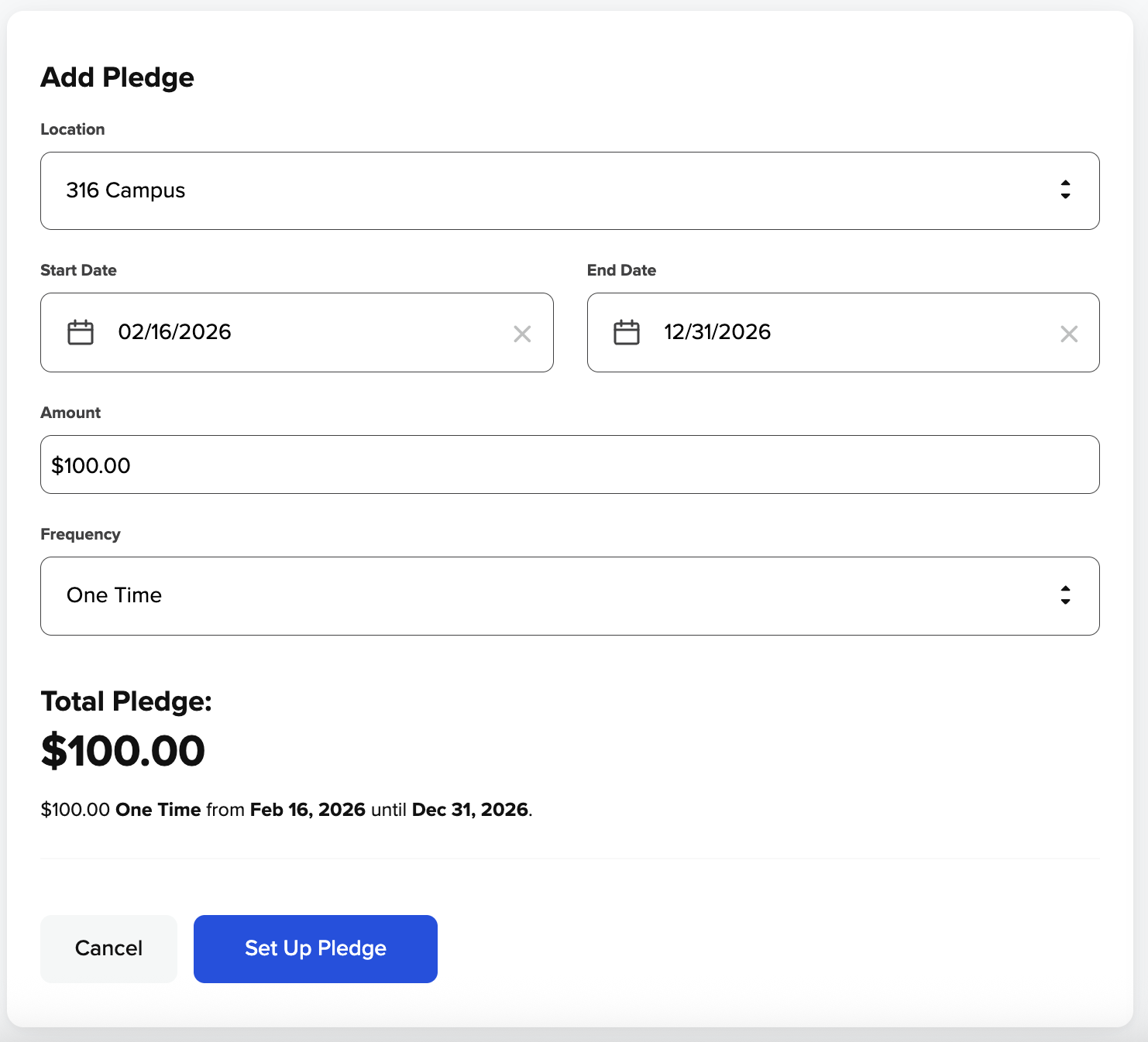 - To create your pledge, choose a location, enter a start and end date, enter a dollar amount, and choose the frequency.