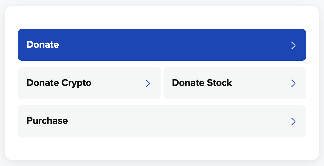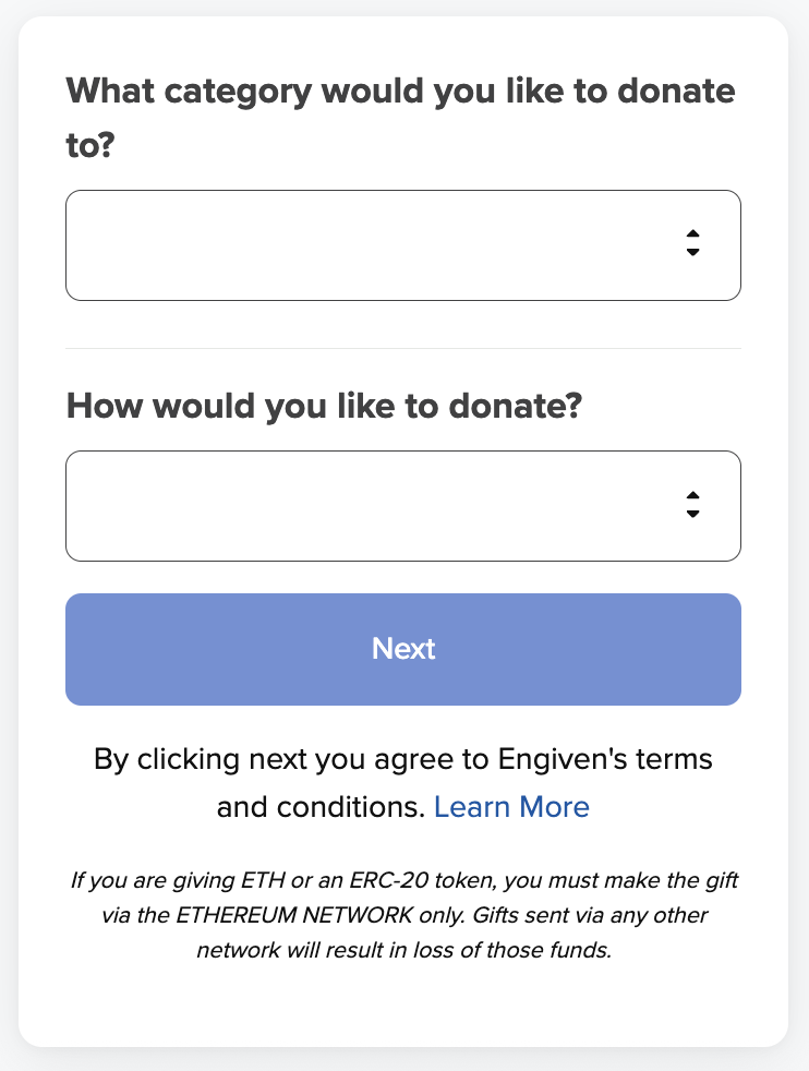 - Choose the donation category you would like to give to (only one category can be selected), and then choose the cryptocurrency type.