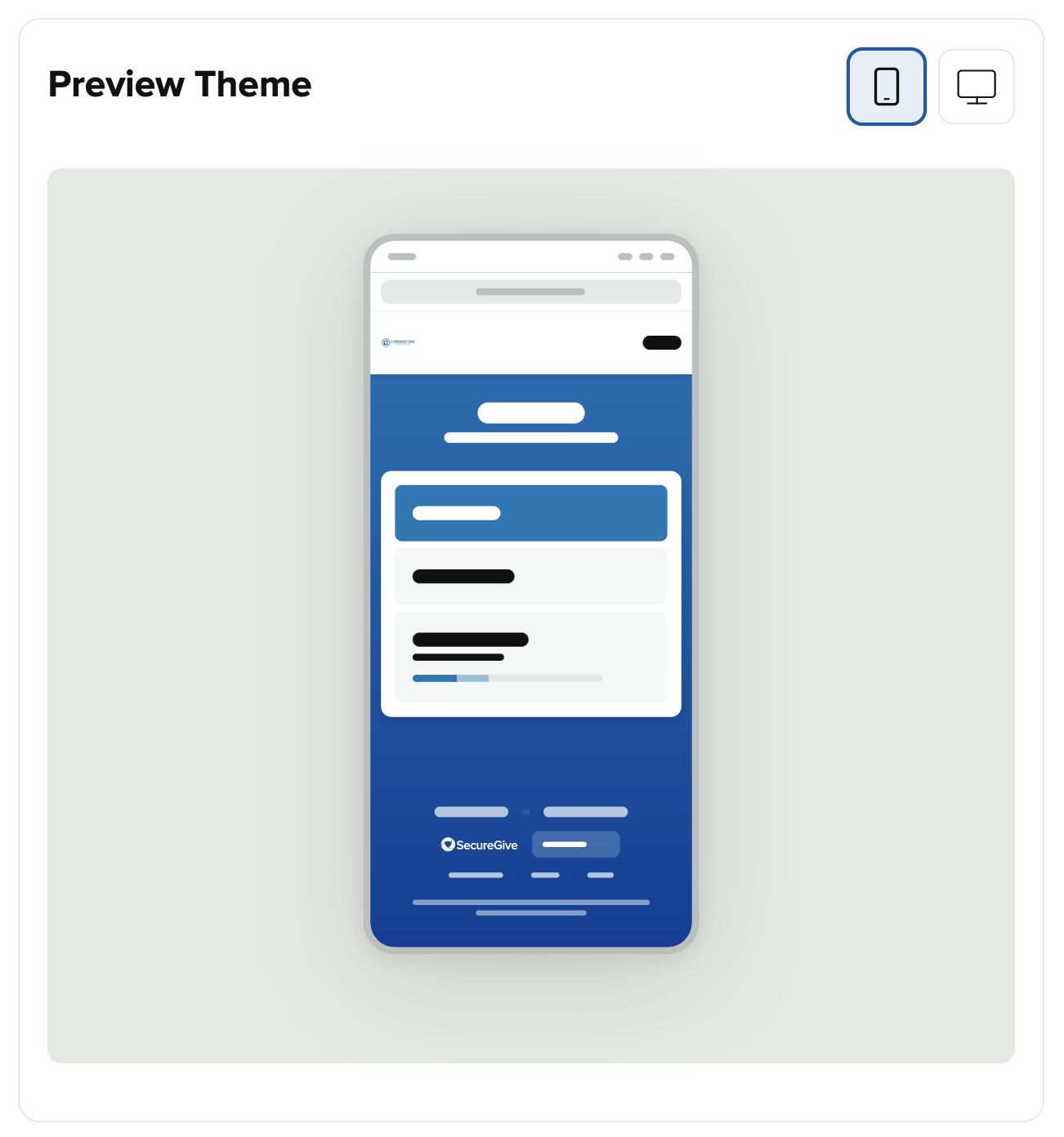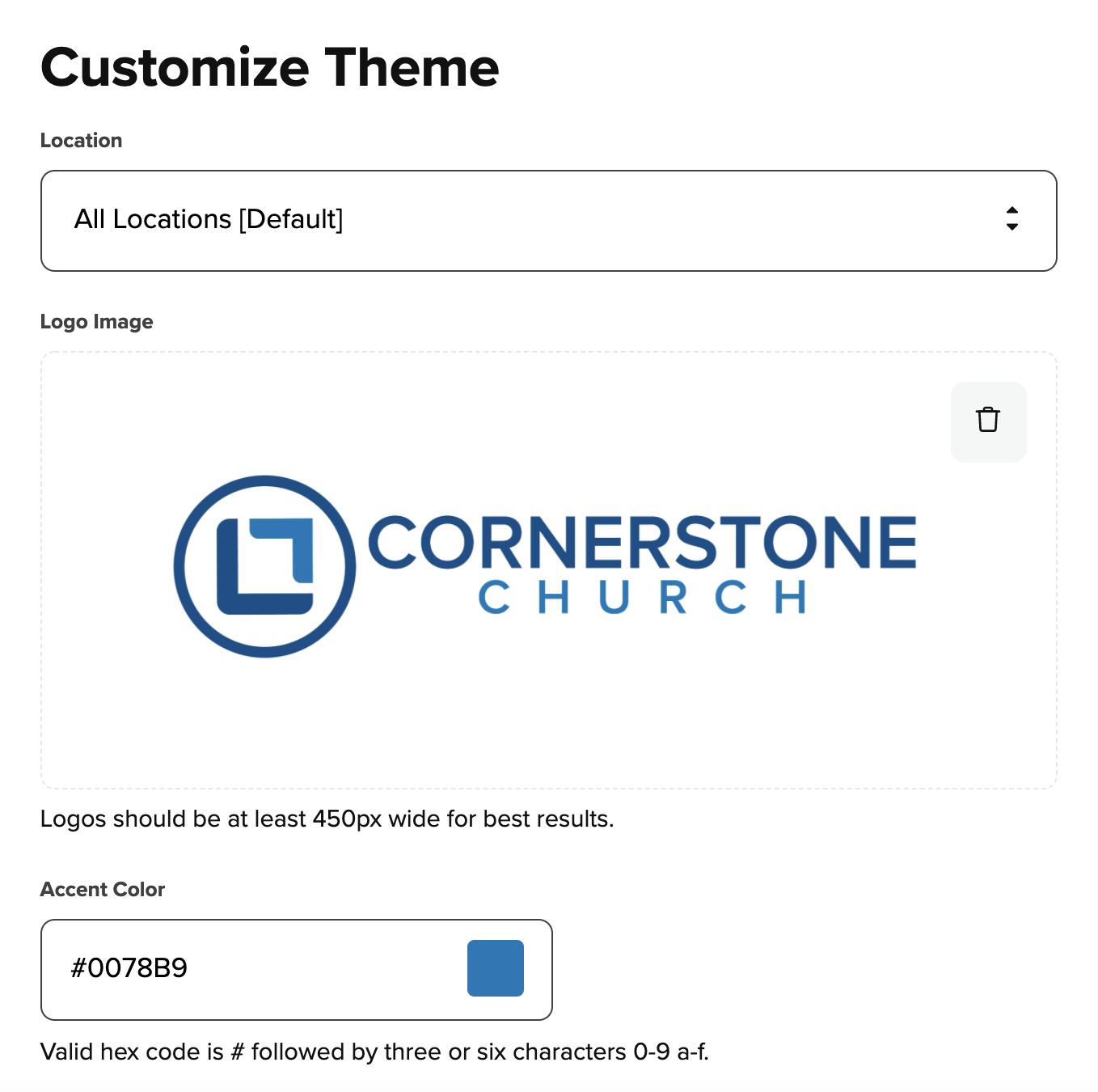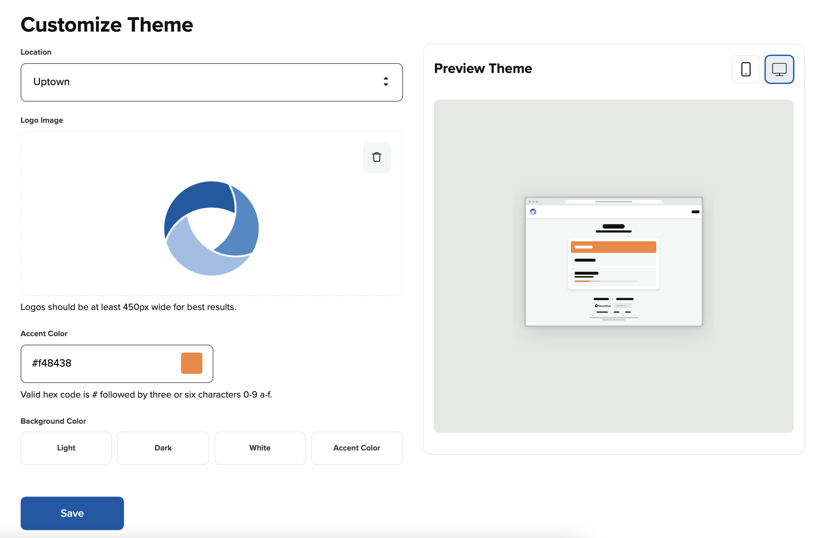 The Customize Theme page allows you to enter in a logo and colors to customize your SecureGive site.