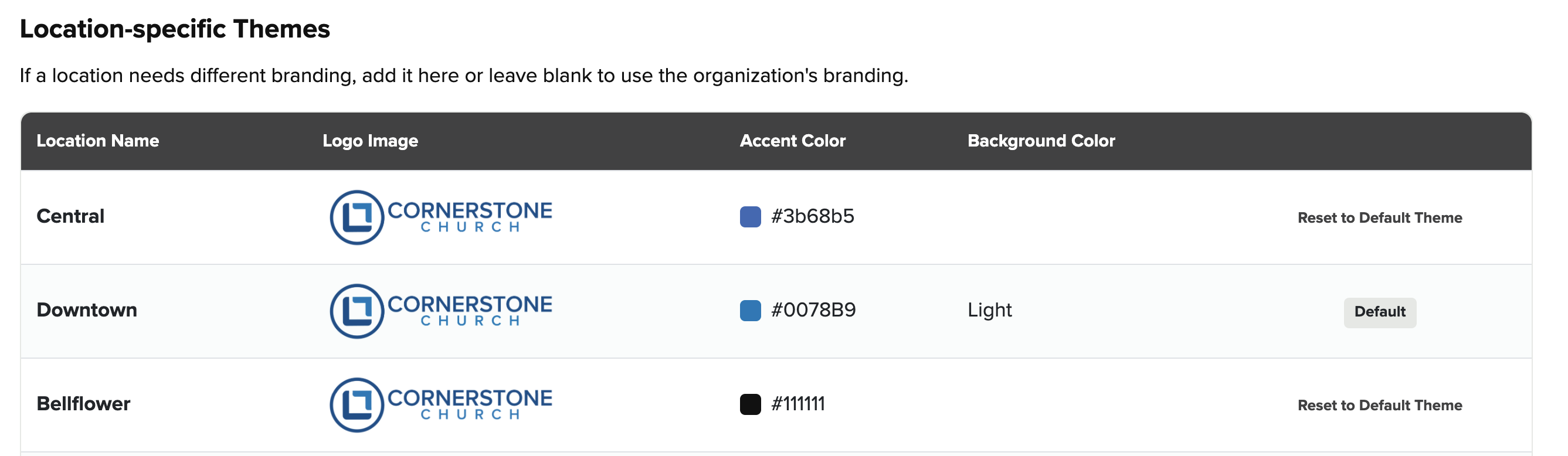 If you have multiple campuses, you can choose a separate logo a colors for each one. If you do not change the logo and colors for a campus, it will use the main logo and colors by default.