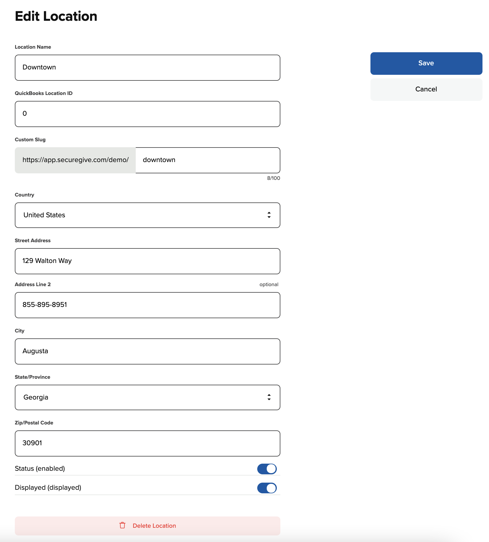 Please Note: A location will not show up for giving until you go to the Donation or Purchase Categories page and choose to display at least one category for this location.