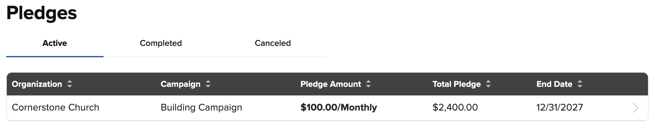 - From the Pledges page you can view your Active, Completed, or Canceled pledges.