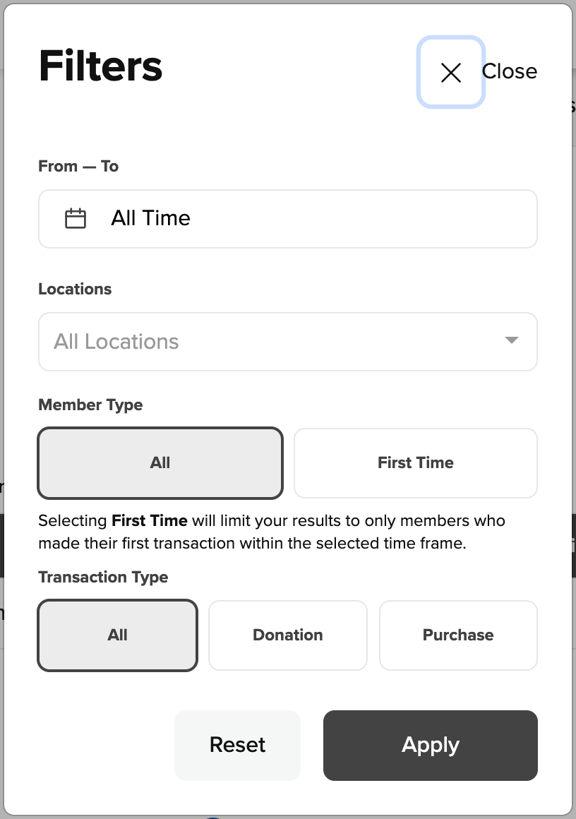 - The Transaction Type allows you to further filter the members list by whether they completed transactions to a donation or purchase category. - Once you've chosen your filters, click Apply.