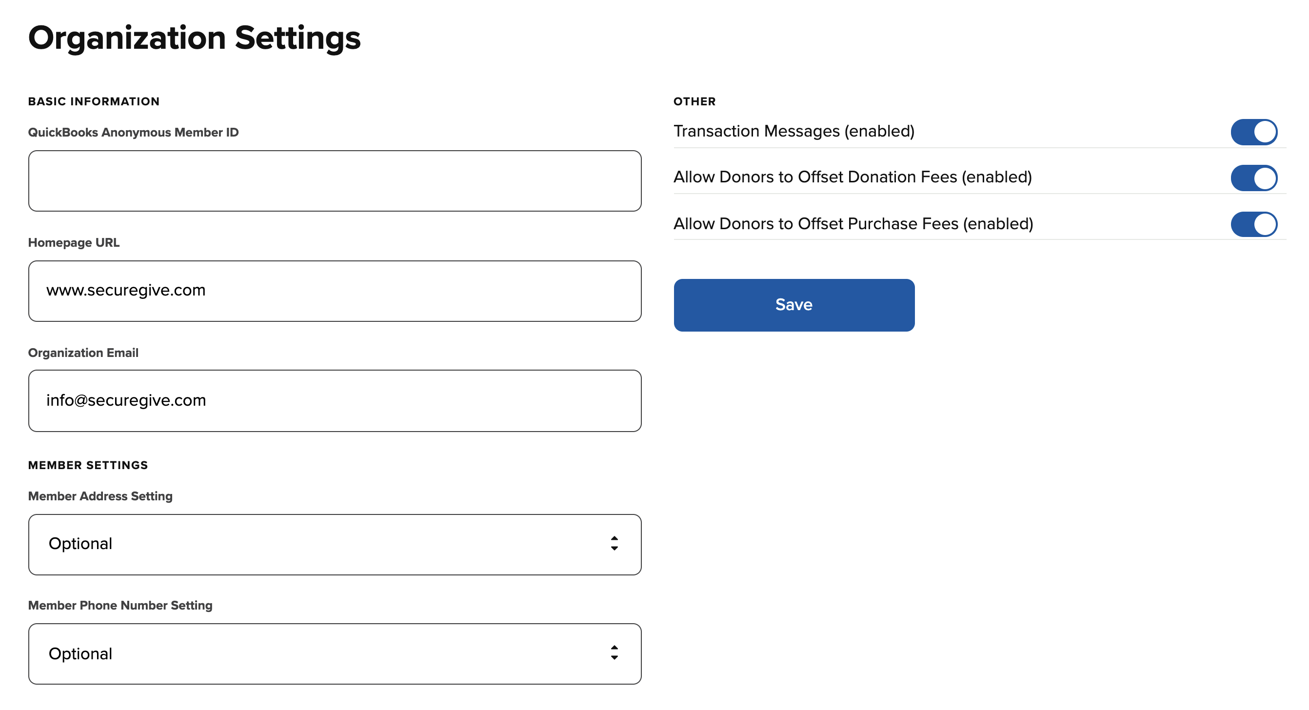 • If you would like your donors to be directed to somewhere other than the SecureGive login page when they sign out, you will enter that URL here. If you leave this blank, it will default to your organization's SecureGive Sign-In page.