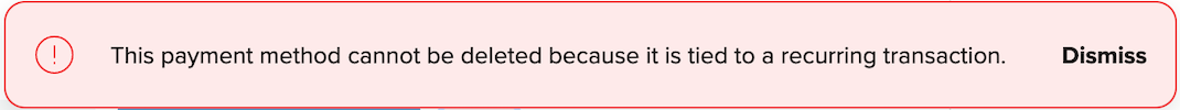 But if you try to delete a payment method and get the "This payment method cannot be deleted because it is tied to a recurring transaction" error, then it means that the payment method is currently associated to an active or paused recurring transaction, and it cannot be deleted because of that.